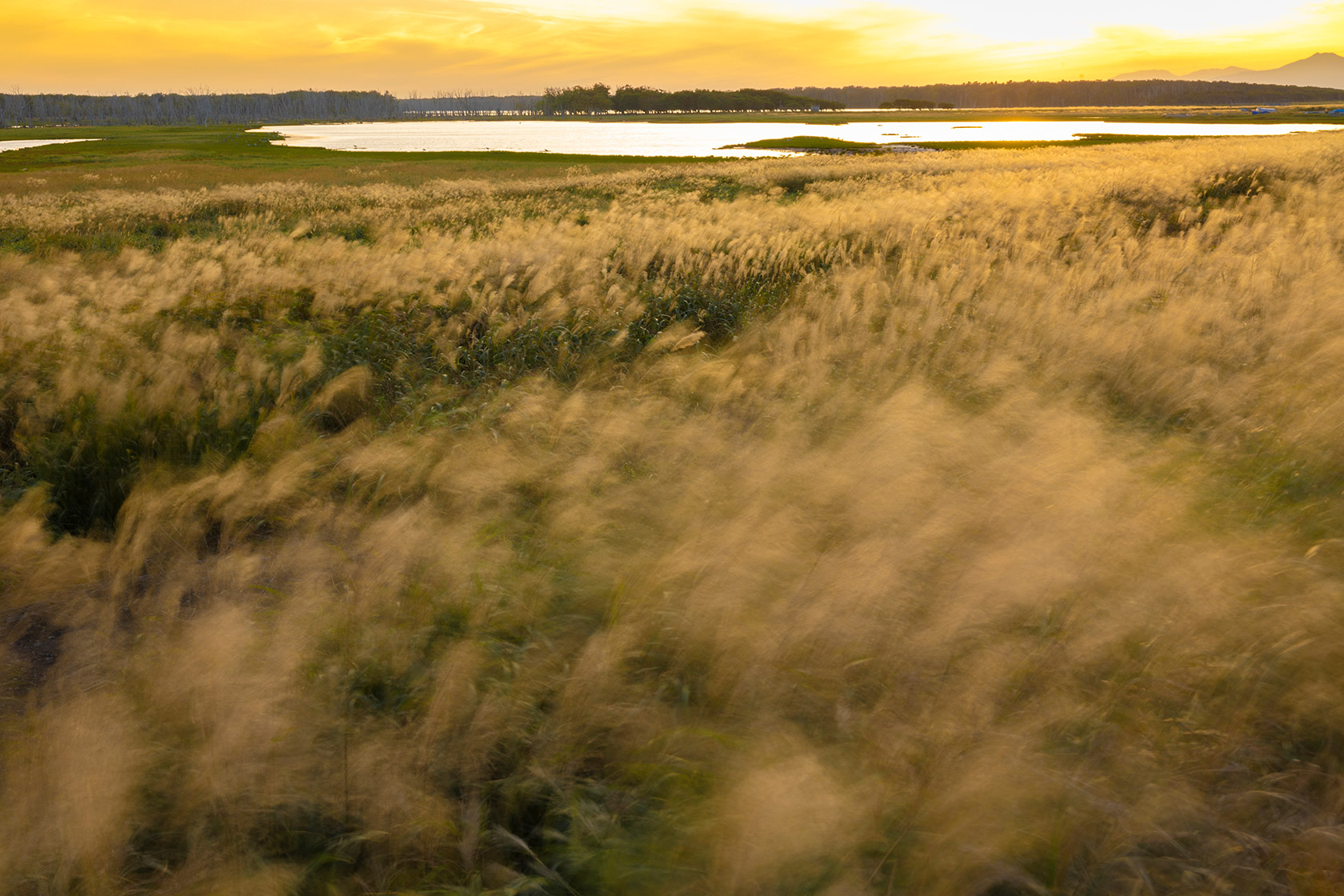 ススキがオレンジ色に染まる夕景がオススメの時間帯。望遠レンズで撮影にすることにより手前のボケを生かしたドラマティックな一枚に仕上がる。