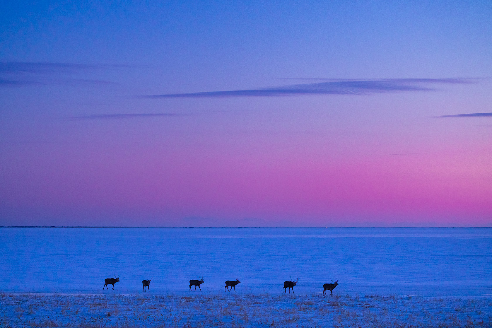 野付湾は、内海ゆえ浅瀬が続き、冬場には全体が凍結。夕暮れの活動期になると森に隠れていたエゾシカたちが列をなし、様々な場所へと凍結した海面を移動。日没やマジックアワーのタイミングは絶好のシャッターチャンスです。