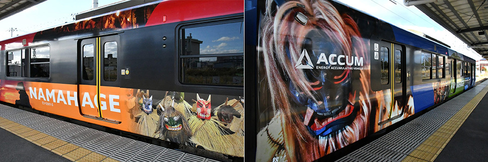 この施策の一環として、男鹿市ではナマハゲや男鹿市の風景の特別ラッピングを施し、キャンペーン期間中、男鹿線で運行しています。2022年のフォトコンテストの受賞作品の一部が採用されました。
