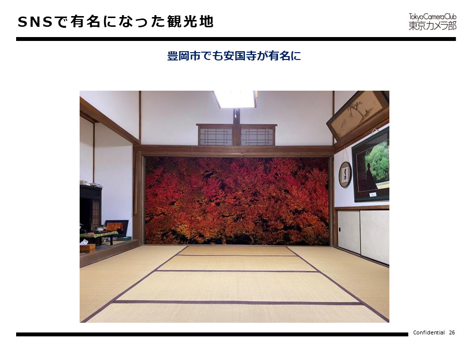 山本氏:はい。豊岡市には安国寺というお寺があります。秋になるとドウダンツツジが紅葉してとても綺麗なお寺です。もともとこのお寺のご住職がカメラがお好きで、ご自身でずっとお寺を撮影されていました。このお寺の写真がSNS上で拡散され、お越しになるお客様が増えたと伺っております。秋になると、行列ができるぐらいです。夜にライトアップもされていて、写真を撮る良いスポットがありますので、紅葉の時期にはいつも行列ができていると聞いております。