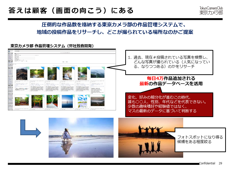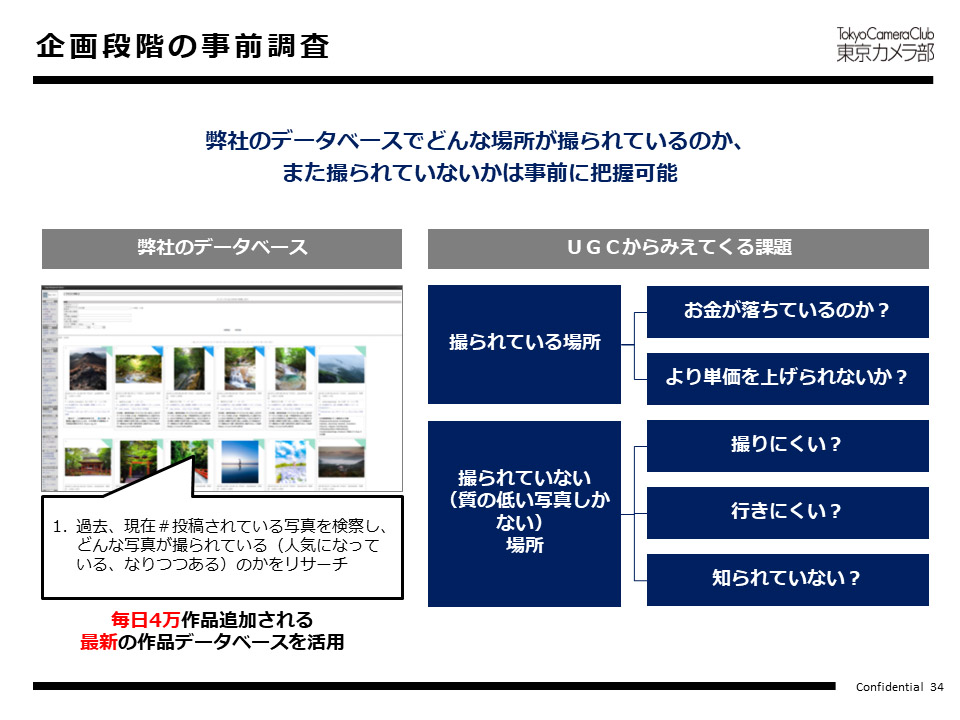 東京カメラ部は写真のデータベースを持っており、その場所でどのような写真が撮られているか/いないかを事前に把握できます。
