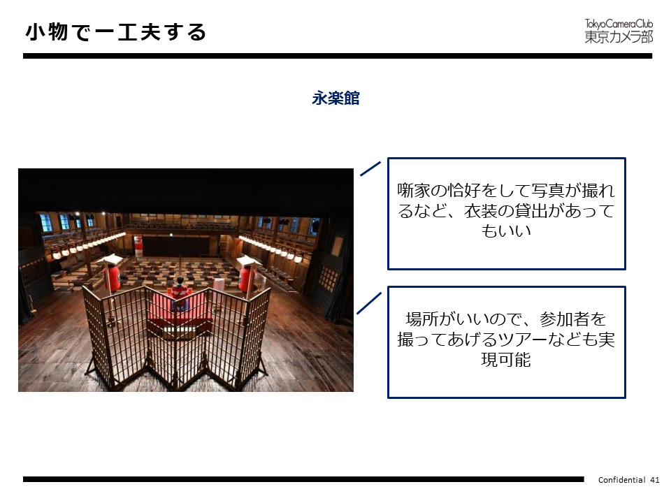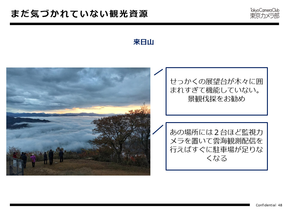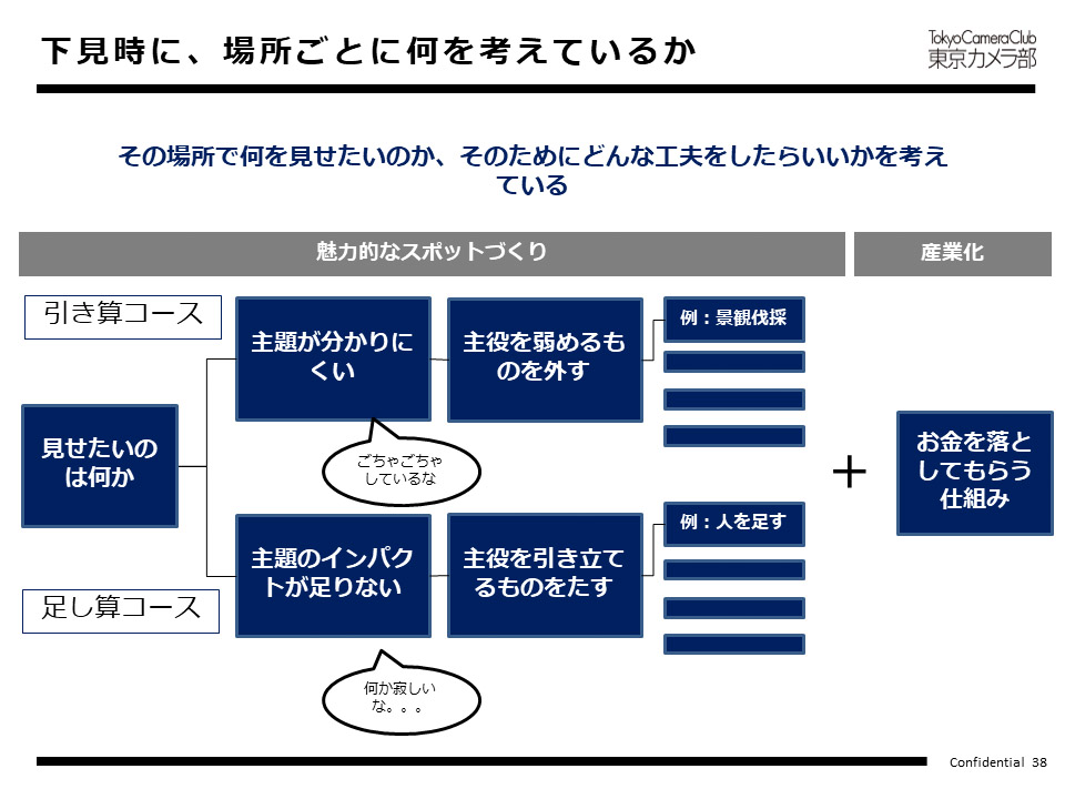 大事なのは、「産業化につながること」で、「お金を落としてもらう仕組みを作ること」です。そうでないとその場所が持続しません。東京カメラ部はこのような考え方で、「下見」をしながら、アドバイスを差し上げます。