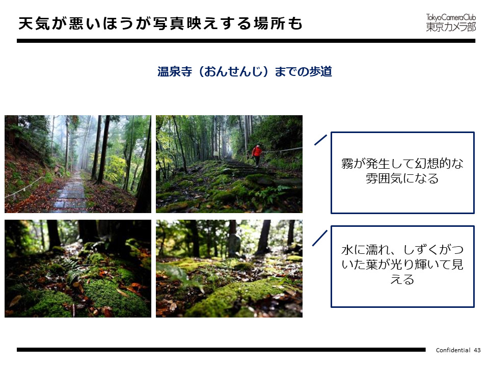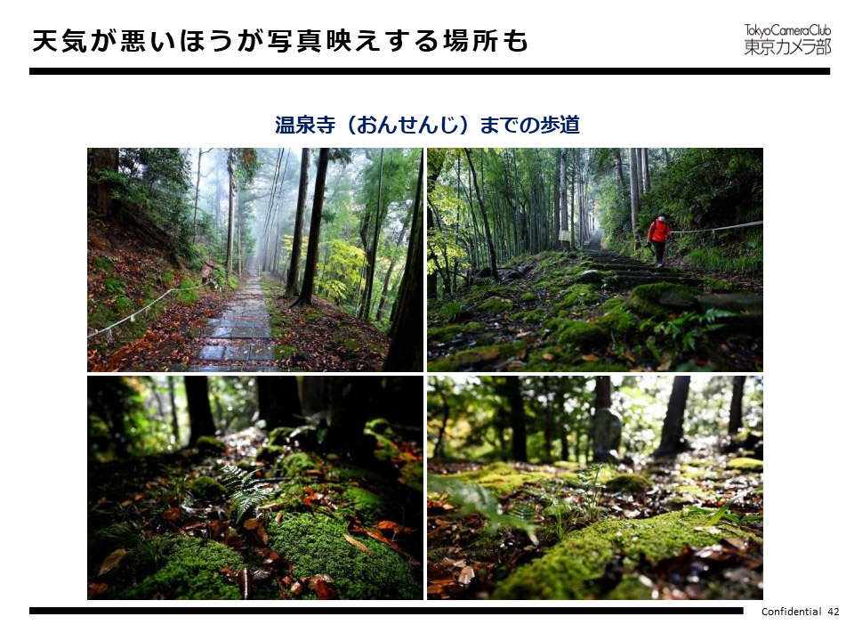 朝日、夕日、夜が活動時間で、日中はほとんど活動しません。また、天気が悪い時、喜んで外に出て写真を撮ります。雨の日は、このような場所は葉っぱに光が反射して美しく撮れますし、靄がでていると幻想的な雰囲気になります。温泉寺までの山道のような場所は、天気の良い日よりも雨上がりのほうが美しい写真が撮れます。太陽が照っている日だけでなく、雨の日も美しいですよ、と訴求できる場所は観光アピールもやりやすいのではないかと思います。