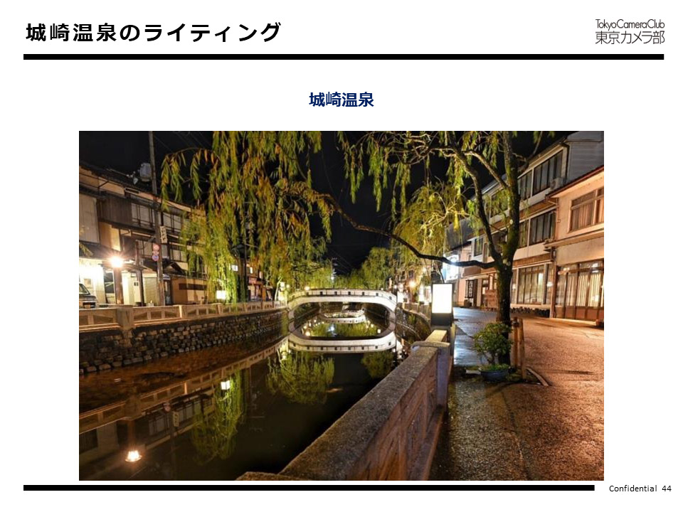 山本氏:城崎温泉の中心地付近の写真です。城崎温泉は平安時代にお湯が出て、現在は7つの外湯を巡るというコンセプトで多くの方がご来訪くださっています。この写真にありますとおり、街の中心に大谿川(おおたにがわ)が流れています。たくさんの方々がお越しになる場所です。