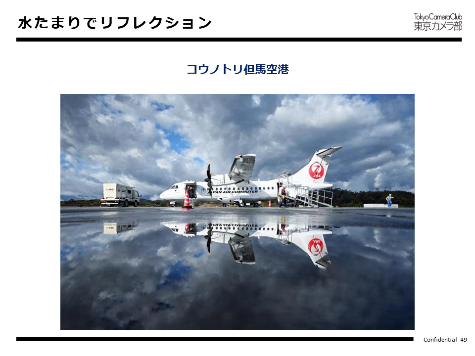 この写真は、飛行機を降りると水溜りがあったので、ローアングルでリフレクションを撮りました。このような場所も観光資源になりますので、今後ツアー化の際にご検討いただければと考えています。