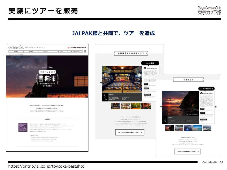 大島氏:東京カメラ部にアドバイスいただいたフォトスポットをとりまとめて、ページを制作しました。ターゲットの写真愛好家の方に閲覧していただけるように、写真とともに位置情報や撮影時間や機材、撮影テクニックなどを、東京カメラ部監修でまとめました。興味を持ってくださった方にはそのままツアー購入できるように、購入ページへの導線も作りました。