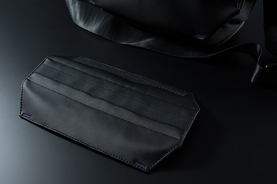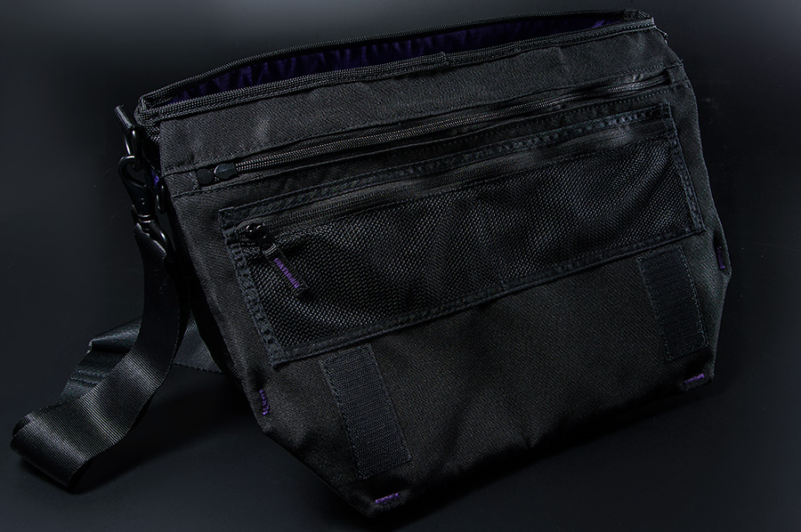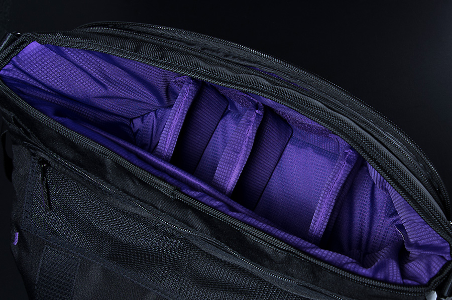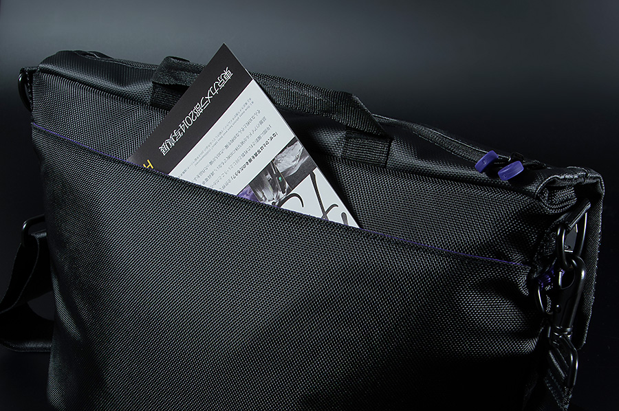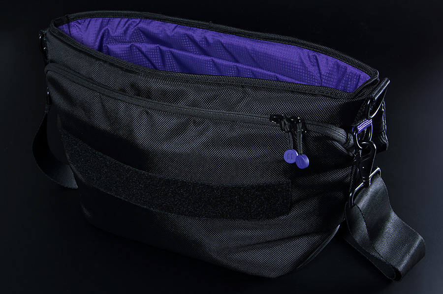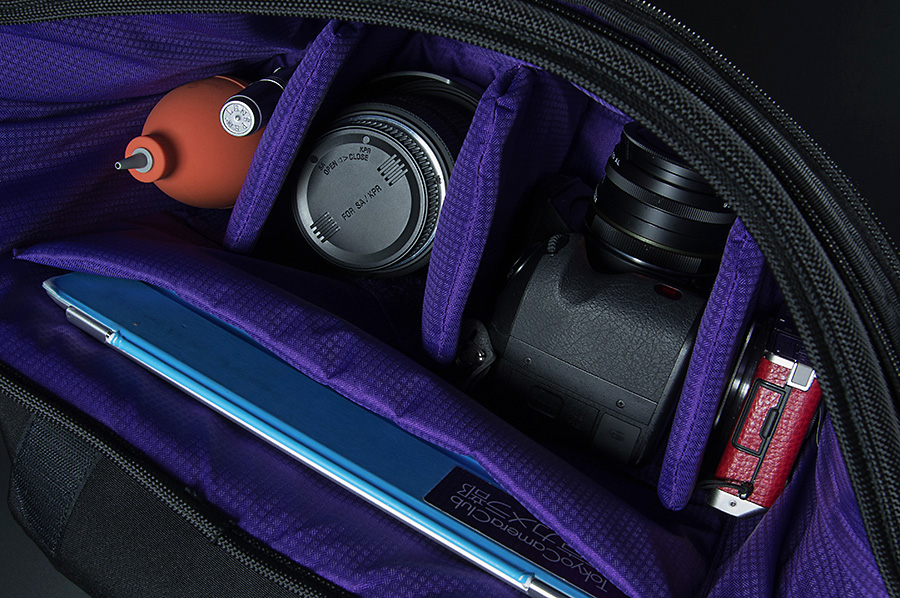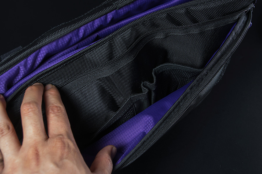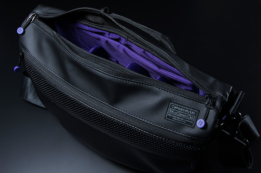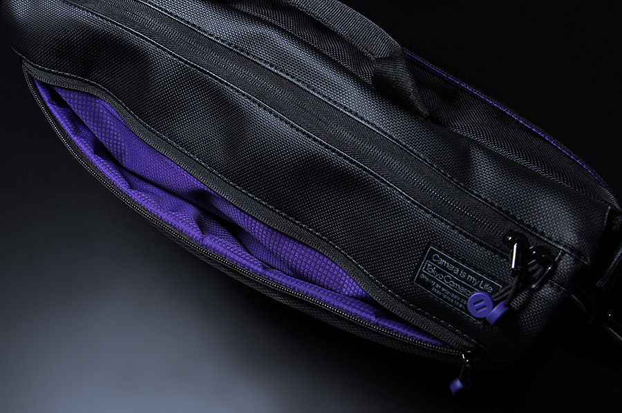 カバンの開けると中は東京カメラ部カラーの紫。落ち着いた紫色です。また、前面には大きな両方から開けられるポケットが付いています。