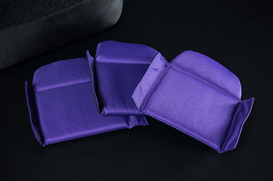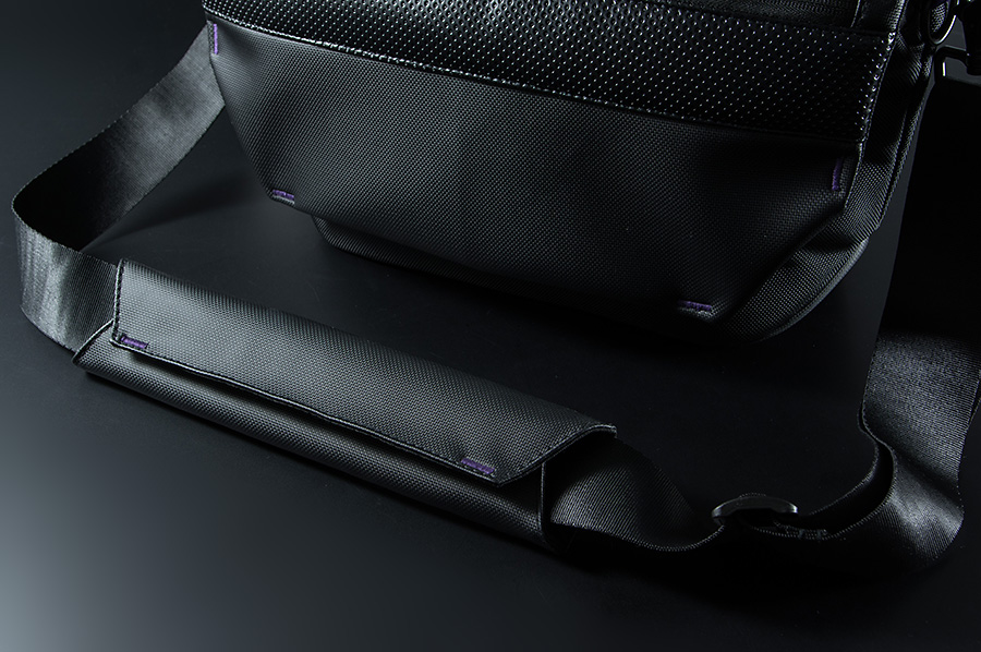 重いカメラを持っても肩があまり痛くならないように厚手のショルダーパッドを付けています。また、ショルダーベルトは車のシートベルトに使われている材質を使っていますのでなめらかで丈夫なものとなっています。