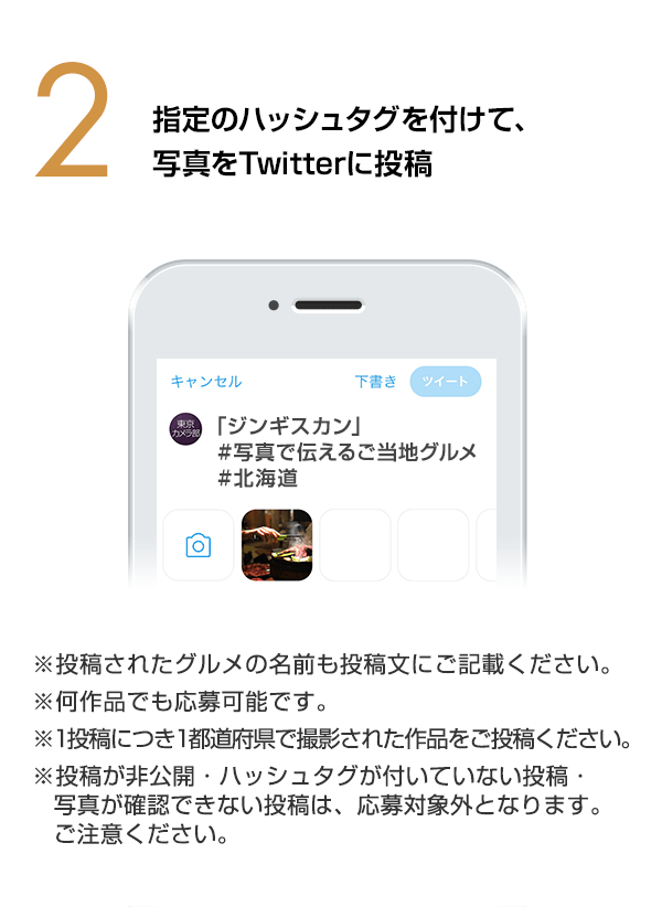 「#写真で伝えるご当地グルメ」+「#撮影地の都道府県名」を付けて、写真をTwitterに投稿