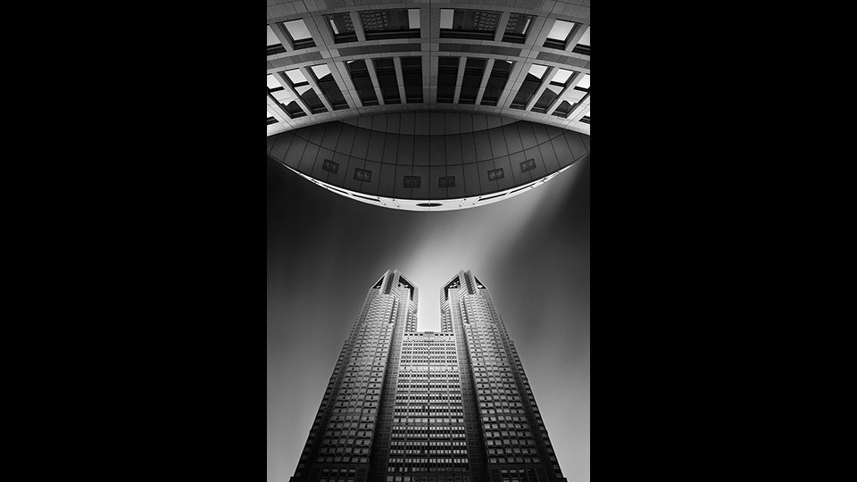 「これは都庁の写真です。Nikon 1 V1で撮影しまして、ワイドコンバータを取りつけました。丹下氏の有名な作品ですね。もちろん都庁の方のコントラストを意識するということはあるのですが、都議会とのコントラスト、2つの一体化している部分を景観設計のコンセプトとして撮影しました。後ろの方は流れています。NDフィルターを使って構造物を浮き出しています。昼の撮影ですが、構造物のテクスチャに合わせたコントラストを出しました。」