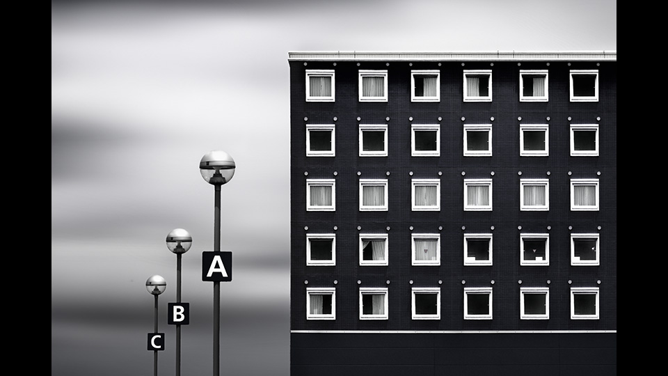 「もうひとつは、たんすに見えるとSNSで言われましたが(笑)、構造物です。設計者が図面を起こすときに二次元で表現しますが、その設計者の頭の中をそのまま表現してみようというコンセプトで二次元のようなフラットイメージにしています。この『A』『B』『C』というのは、もっと手前にあるライトを被写界深度をより深く、2つ一緒に撮影しています。こちらもNDフィルターを付けまして、昼間ですけれども流してやる。そうすることによって、この『A』『B』『C』と構造物が浮き出てくるというコンセプトです。」