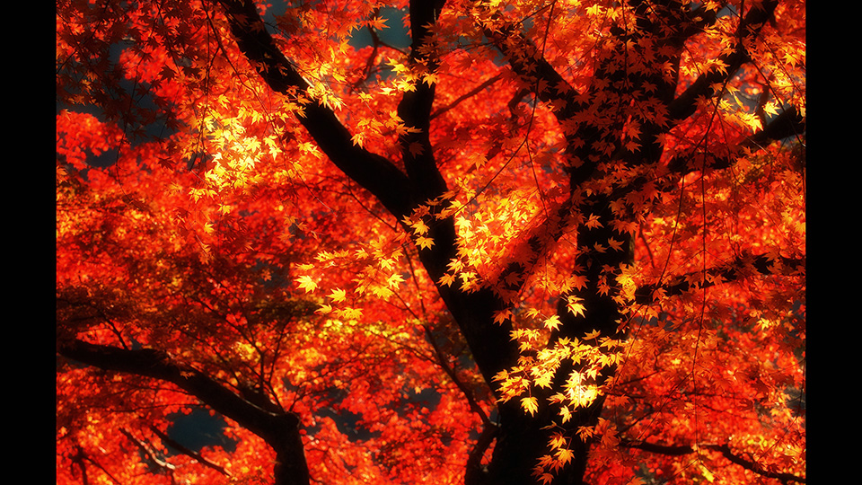 「これは奥多摩にある有名なイロハカエデです。毎年秋に撮影していたのですが、毎年状況が違うんで楽しみに行っていました。このときは逆光の状態で、ちょうど光が差してきた時に撮りました。普通に撮ると黄色い紅葉の部分が白く飛んでしまって、他が暗くなってしまいます。現地では飛ばないように抑えて撮影して、RAW現像で色を出しています。これは東京カメラ部のカレンダーに入れていただきました。」