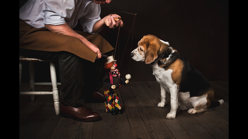 「こちらは一枚め同様、スタジオでの撮影です。私は作品を作るにあたって、まずイメージをスケッチして、それを絵で描きためています。そして後で見返しておもしろそうな作品を小物を使って形作っていきます。これも以前に描いた絵を元に、パペットの人形を買ってきて作っています。