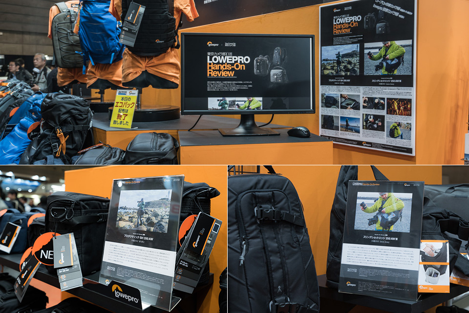 東京カメラ部10選による「ロープロ」カメラバッグのハンズオンレビューをパネル展示。また、ハンズオンレビューのWEBサイトが閲覧できるPCモニターを設置。