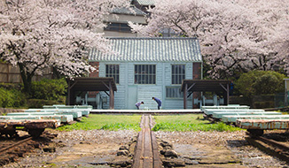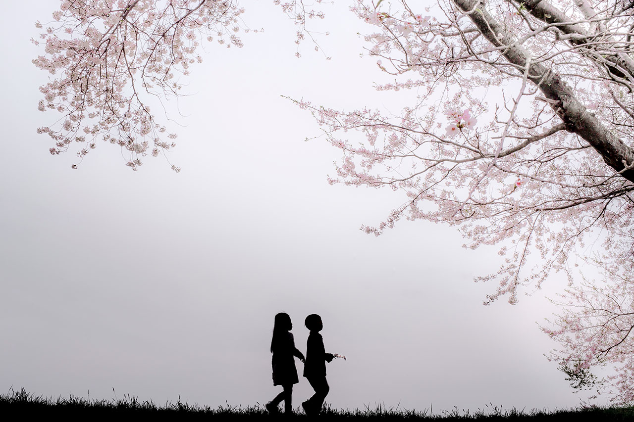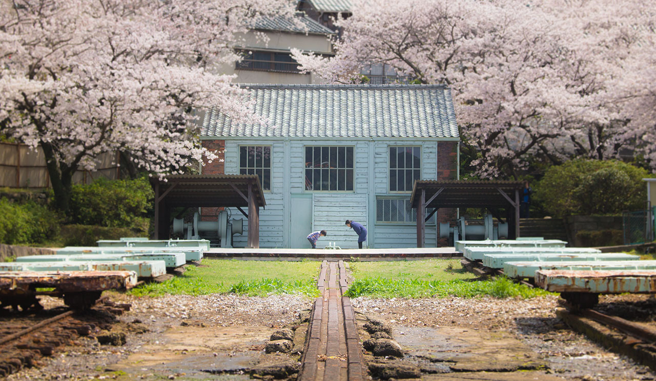 ここは、「小菅修 船場跡」という場所で、現在「明治日本の産業革命遺産」の構成遺産として、軍艦島とともに世界遺産登録を目指している場所です。また、この場所は実家の近くでもあり、毎朝ここを見下ろすバス停で通学のバスを待ったものです。春になると毎年満開の桜が咲き誇ります。今年は幸いまとまった時間が取れたので、桜の咲いていく様子をタイムラプス動画に収めようと思いました。いくつか撮影ポイントを決め、毎日のように撮りに行きました。満開になったこの日も撮影ポイントを回っていたのですが、正面から撮っていた際、花見に来ていた親子が建物の前の溝を覗きにきました。実はこの溝にはカメの親子が暮らしています。いい絵だなぁと思い、慌ててカメラの設定を変えてシャッターを切りました。そんな一枚です。