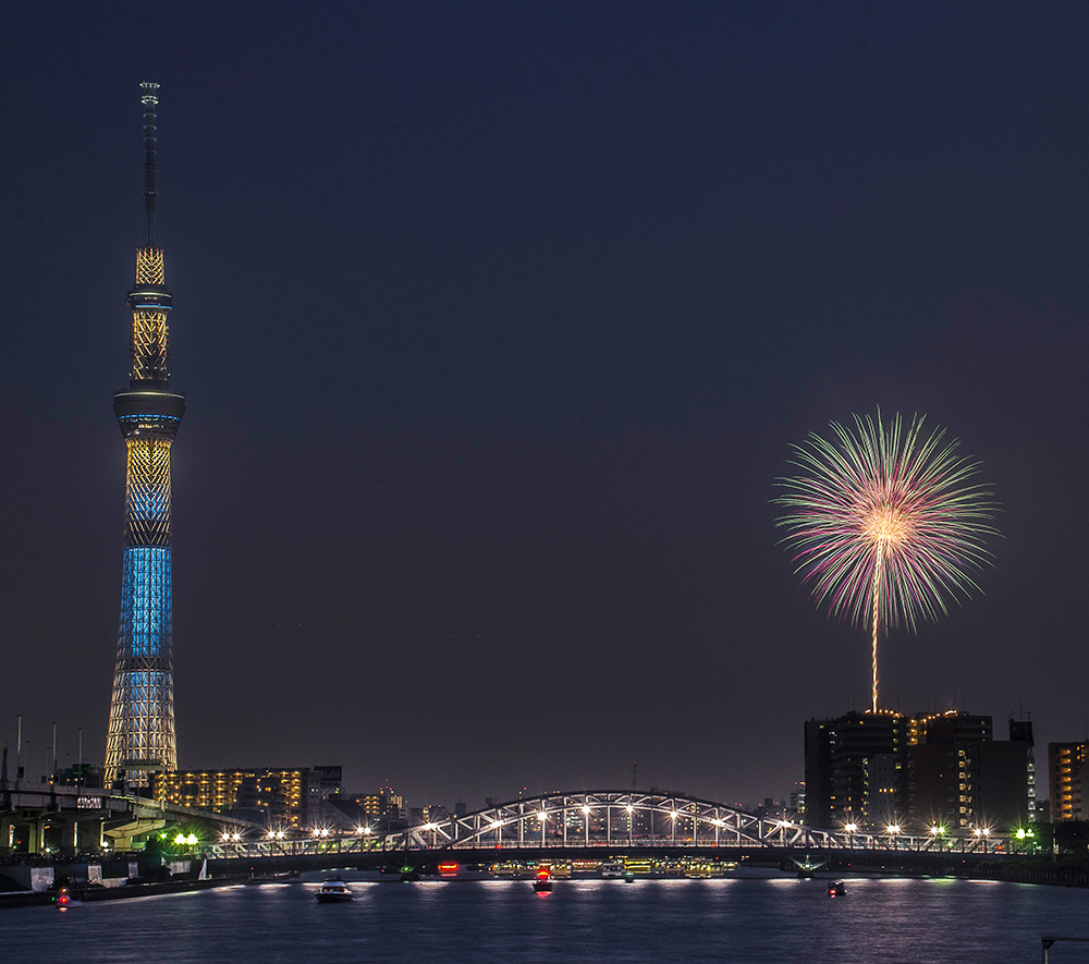 昨年、2014年の隅田川花火です。最初は定番の屋形船と迫力ある花火をと考えていたのですが、せっかく東京スカイツリーがあるので、どうせならこっちとセットにしようということで場所探しを行いました。会場からはどんどん離れ、3kmほど北上したところの汐入公園から撮影することにしました。 ここからが本当の地獄で花火大会開始までの8時間、ひたすら炎天下の中で待つことになります。ひまつぶしに触っているスマホの電池はすぐに切れそうになるし、寝ても暑さですぐに目が覚めるし。それでも待ちに待って花火大会が始まって実際あがった花火をいざ見てみると思ったより小さい…。 という絶望の中で撮れた一枚です。花火に迫力こそないものの、まるで線香花火を楽しむかのような情緒がそこにはありました。 そして今回のフォトコンテストに選出していただき、本当にあの時諦めなくて良かったなぁと改めて思いました。