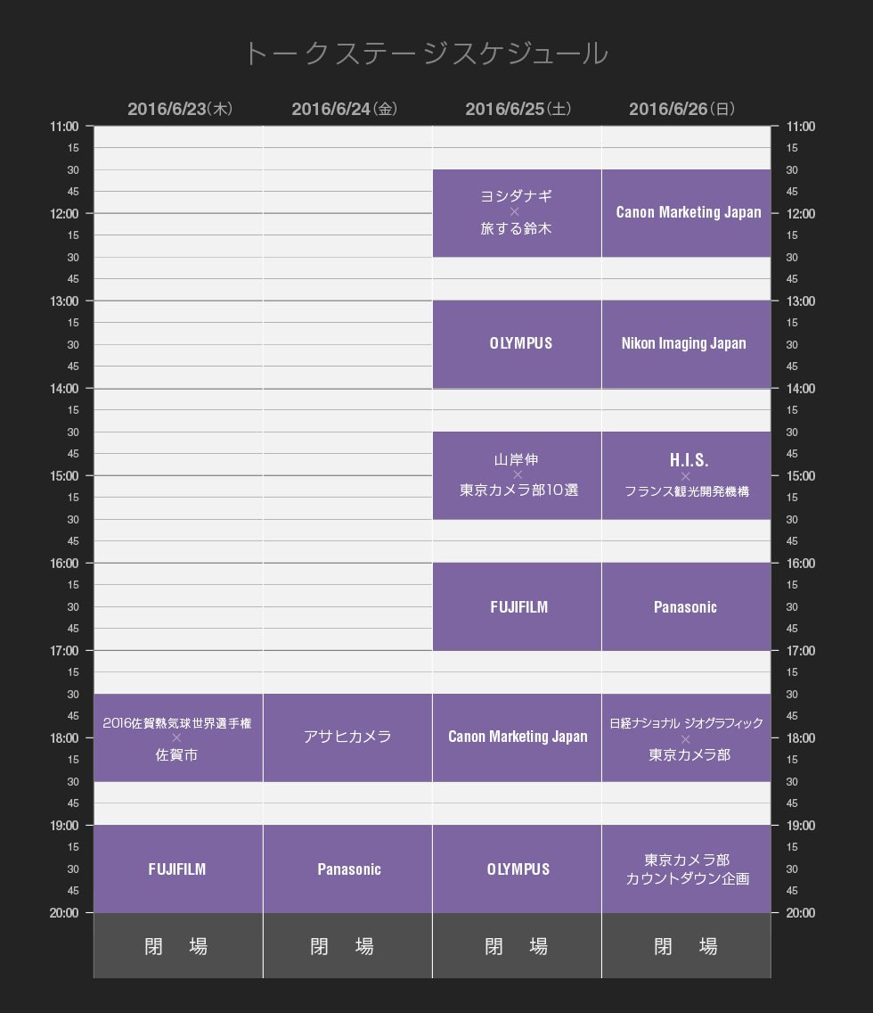 | 17:30~18:30 | キヤノンマーケティングジャパン | 東京カメラ部10選 柄木孝志氏、工藤悦子氏、八木千賀子氏 × EOS 80Dパンフレットチャレンジ 「スペシャルトーク」 |