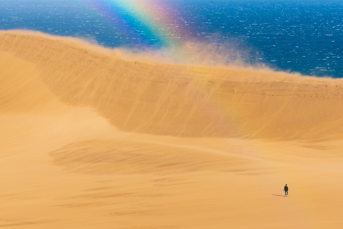砂嵐みたさに訪れた暴風警報発令中の鳥取砂丘。重々しい鉛色の空、背中を預けても倒れない強風、容赦なく打ち付ける激しい雨と飛砂。太陽の日差しとともに青空が顔を覗かせ、ゆっくりと巨大な虹のアーチを作り出した。あの時の感動と興奮を、今回地元鳥取県枠で選出いただけたことは無上の喜び。また、毎年心待ちにしている写真展、今年は観るだけでなく、観ていただくという楽しみも加わり過去一番の思い出に。開催、運営いただいた皆様に心より感謝を申し上げます。素晴らしい時間をありがとうございました。