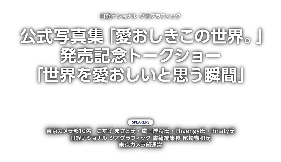東京カメラ部運営 塚崎(司会)「みなさん、こんにちは。東京カメラ部の塚崎です。本日、司会を務めさせていただきます。これから公式写真集『愛おしきこの世界。』発売記念トークショー『世界を愛おしいと思う瞬間』を開催させていただきます。本日ご登壇いただく4名の方は、東京カメラ部10選のこすげまさとさん、廣田達将さん、Phaengyさん、Rinatyさん、そして日経ナショナル ジオグラフィック書籍編集長の尾崎憲和さんです。本日はよろしくお願いします」