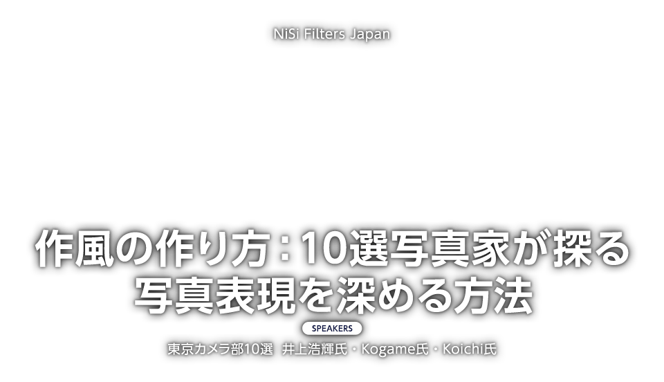 9月23日(月・祝)に行われたNiSi Filters Japanのトークショーでは、東京カメラ部10選の井上浩輝氏、Kogame氏、Koichi氏にご登壇いただき、「作風の作り方:10選写真家が探る写真表現を深める方法」というテーマでお話しいただきました。