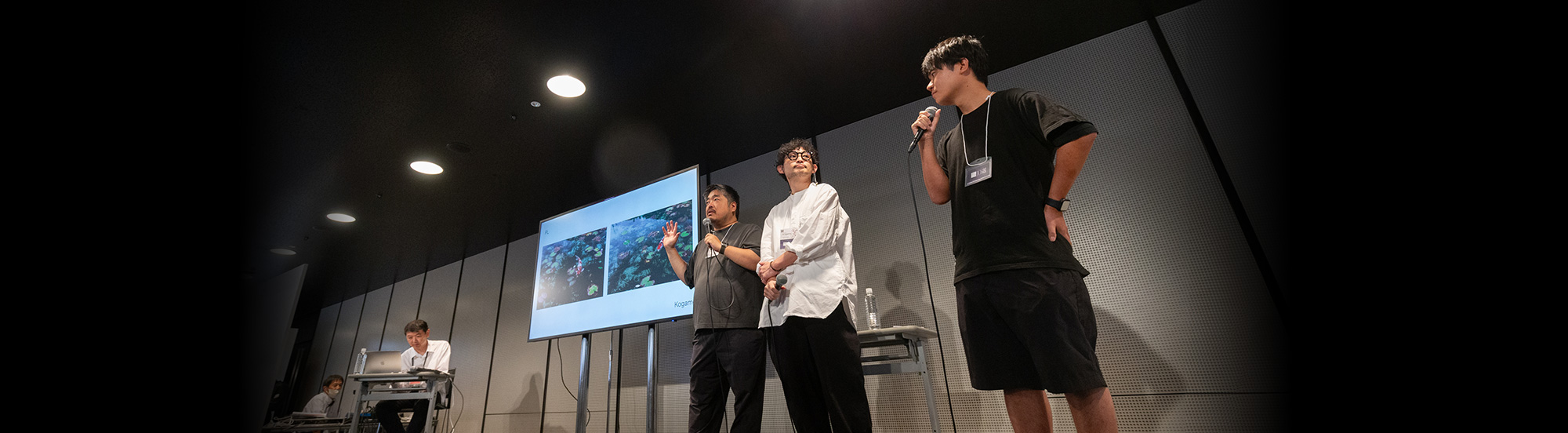 井上「今回、作品の独自性を視覚的、技術的、そして発表方法、さらにはそれらがどう一貫して継続され、多面的に展開されているのか、こんなところからお話を聞いてみたいと思います。みなさん、こんな感じで聞いてください。このふたりだからこそ、というものはどこにあるのか。彼らの作風作りというものを見ていければと思います。まず、視覚的という観点からおふたりの作品を見ていきます。Kogameさんは作品を考えるとき、視覚的特徴や見栄えというのを、どのように考えて展開されているのでしょう」