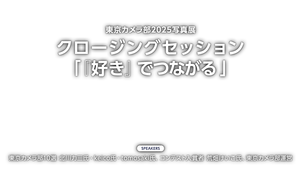 9月15日(月・祝)に行われた「東京カメラ部」のトークショーでは、東京カメラ部10選 北川力三氏、東京カメラ部10選 keico氏、東京カメラ部10選 tomosaki氏、コンテスト入賞者 荒畑けいこ氏にご登壇いただき、東京カメラ部運営とともに「東京カメラ部2025写真展 クロージングセッション『「好き」でつながる』」というテーマでお話しいただきました。