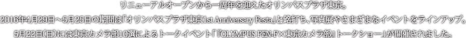 昨年5月、新宿にリニューアルオープンした「オリンパスプラザ東京」。その1周年記念イベントにて、「『OLYMPUS PEN-F×東京カメラ部』トークショー」を開催。また「オリンパスプラザ東京 クリエイティブウォール」にて「『OLYMPUS PEN-F×東京カメラ部』 10人展」も同時開催されました。