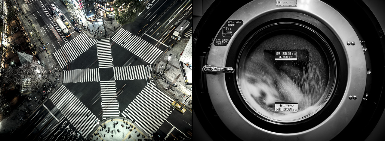 千田「どちらも手持ちで撮影しています。左側は最近人気になっている銀座のビルの屋上から撮りました。人と車の軌跡を残したかったので、手持ちでシャッタースピード2秒という長時間露光をしましたが、PEN-Fには強力な手ぶれ補正が搭載されているので、ブレることなく撮ることができました。右側はコインランドリーです。我が家の洗濯機が壊れてコインランドリー通いが3日続いたんですが、こういう写真も撮れるだろうと思い喜んでコインランドリーに行きました(笑)。使用したレンズは『M.ZUIKO DIGITAL ED 12mm F2.0』。生活感が出ずアーティスティックな雰囲気になるように模索しました。こちらも1/13秒と遅めのシャッタースピード。手ぶれ補正があることで、夜景を狙うとき以外は三脚を持ち歩かなくて済むようになり、とてもありがたいですね」