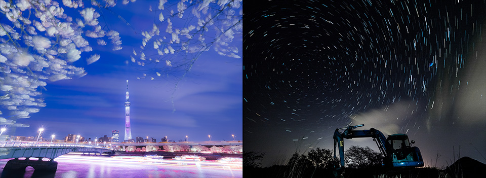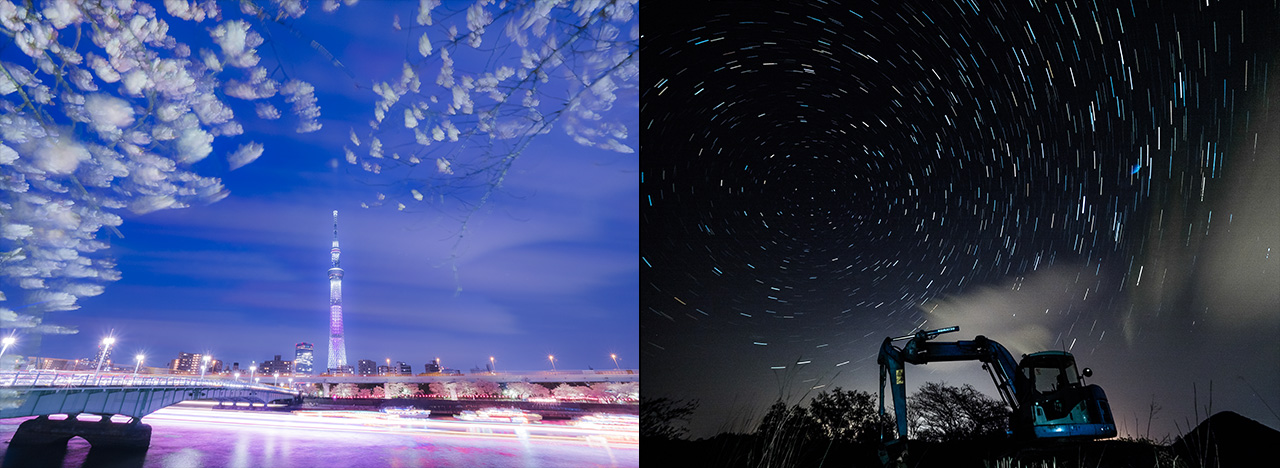 千田「どちらも使っています。左側の写真は、15秒の露光を10分近く重ねています。明るい部分を合成していくので、写真全体が明るくなるのではなく、光の部分のみがとても美しく描写されました。右側の写真は、岩手県の実家に帰省したときに撮影しました。一面、菜の花畑だったのですが、菜の花で埋め尽くした写真にするのではなく、ショベルカーを意図的に大きく写しました。露光時間は 25 秒、カメラ内で比較明合成してくれるライブコンポジットを使っています。夜景撮影時にはほとんど使っている重宝する機能ですね」