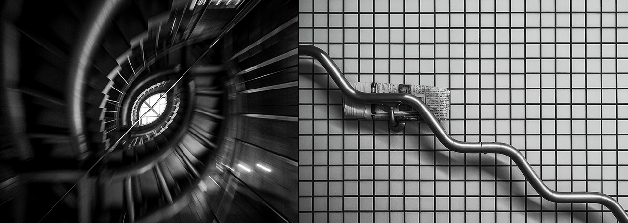 千田「左側は大好きな螺旋階段です。奥の光の部分を中心に持ってくるだけではありきたりだと思い、シャッターが開いている間にズームをする『露光間ズーム』を使い、動きを作りました。右側の写真は大好物満載です。格子状の模様に特徴のある手すりが対角線上に伸びていて、そこに新聞紙が挟まっていました。これは撮らないと、と思いましたね。格子に歪みが出てはいけないので、壁に正対することを心掛けました。レンズは『M.ZUIKO DIGITAL ED 12mm F2.0』でしたが、歪曲にしにくいレンズで、ほぼ編集で補正をかけることなく仕上げられました」