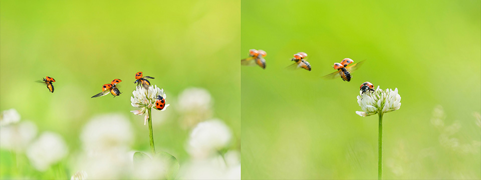 鈴木「炎天下の中、3時間くらい粘って、てんとう虫が飛ぶのを待ち続けました。手持ちで撮影しているのですが、手ぶれ補正が効きました。シャッタースピードは1/2000と高速ですが、手ぶれ補正をオンにしていると、液晶モニターがゆっくりと動いてくれるので、てんとう虫を狙いやすくなるんです。使用したレンズはマクロレンズではなく、最短撮影距離が短い『M.ZUIKO DIGITAL ED 40-150mm F2.8 PRO』。このような生物を撮るときには連続撮影枚数が重要ですが、1秒間に10枚連写、連続撮影枚数はRAWで39枚ということで、ストレスなく撮影できました」
