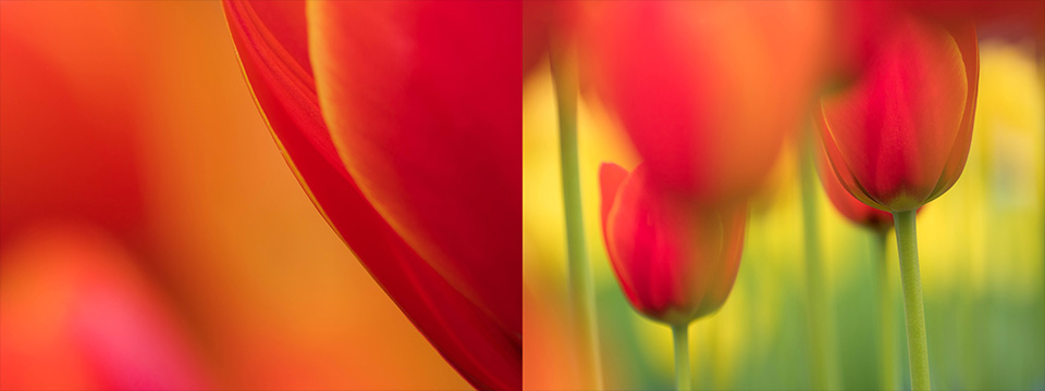 鈴木「これも『M.ZUIKO DIGITAL ED 40-150mm F2.8 PRO』で、『M.ZUIKO DIGITAL 1.4x Teleconverter』を使い、チューリップの側面を撮影したものです。マクロレンズ並みの撮影が可能ですし、右側の写真のように、前ボケと後ボケを同時に表現するような撮影もできます。ボケ味も美しく、この組み合わせで幅広い撮影ができるので楽しかったです」