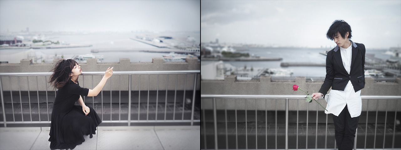 宇賀地「テーマはパラレルワールド。平行世界です。別々の世界にいる男女が、それぞれの世界が少しだけ重なった瞬間に出会い、別れるというテーマで撮影しました。撮影途中にパラレルワールドにしようと決めたので、各モデルさんは別の日に撮影をしていて、ふたりは一度も会ったことがありません。場面ごとにイラストを描き、事前に撮影イメージは決めて臨みましたね。まず1枚目は、別々の世界にいるけれど、なんとなくお互いの存在を感じて、隣に誰かいるのかなと感じているようなイメージです」