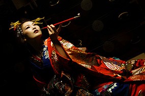 この写真は、広島県の観光名所鞆の浦で年に1~2回開催される花魁パレードの合間に撮影させていただいたものです。モデルの神原みおさんが自分で参加申込みをされてそのカメラマンに指名していただいたので、当日は自分に気合を入れて臨みました。最近のコスプレブームの中で花魁姿もよく見かけるようになりましたが、一部では日本の恥の文化だと言われる方も多いようです。撮影前にそんな花魁の歴史を研究しているうち普通に明るく綺麗に撮ることはイメージできなくなり、華やかな衣装を纏った花魁の心の中の陰の部分を表現するべきだと決めて撮影しました。